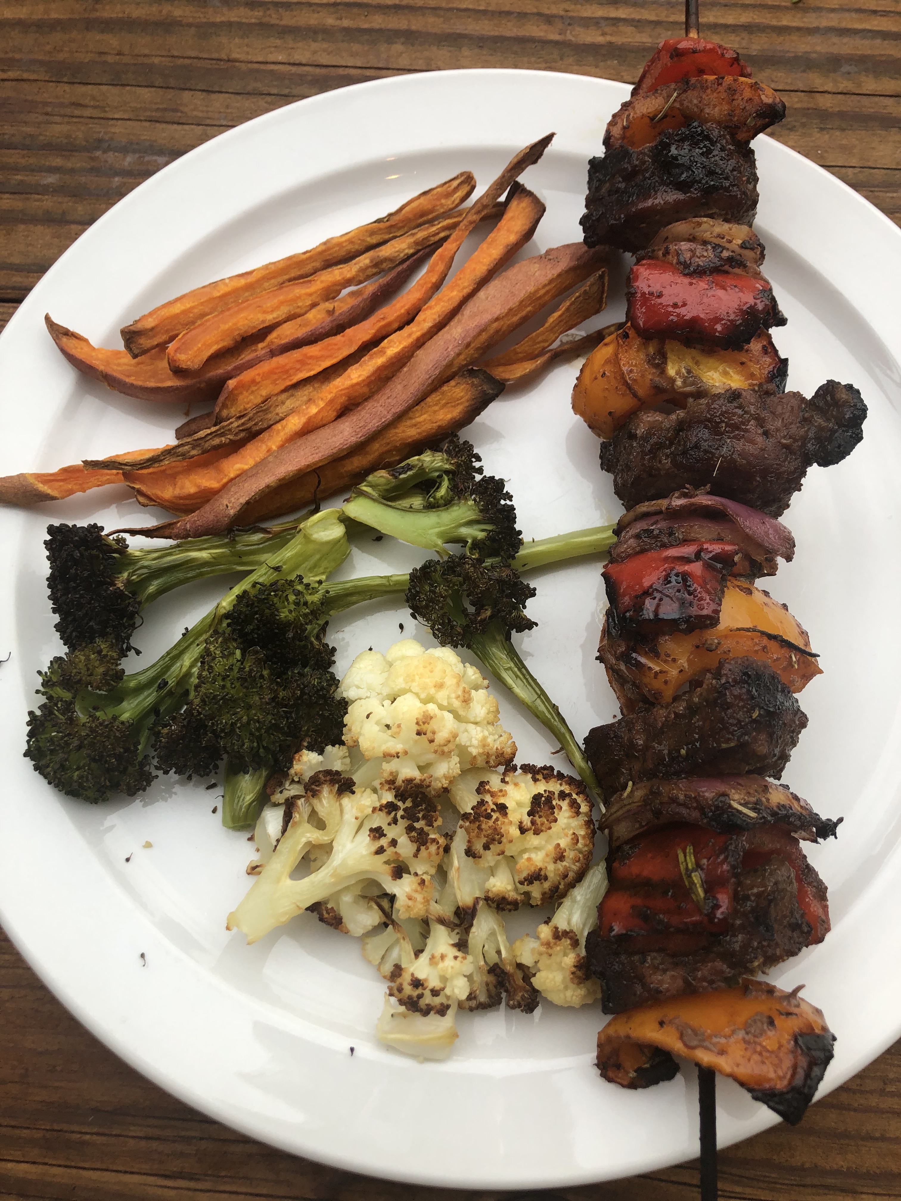 On the menu tonight is Grilled Steak Kabobs with a side of roasted broccoli, cauliflower and sweet potato fries. This is how I build a nutritious and tasty dinner for my family: