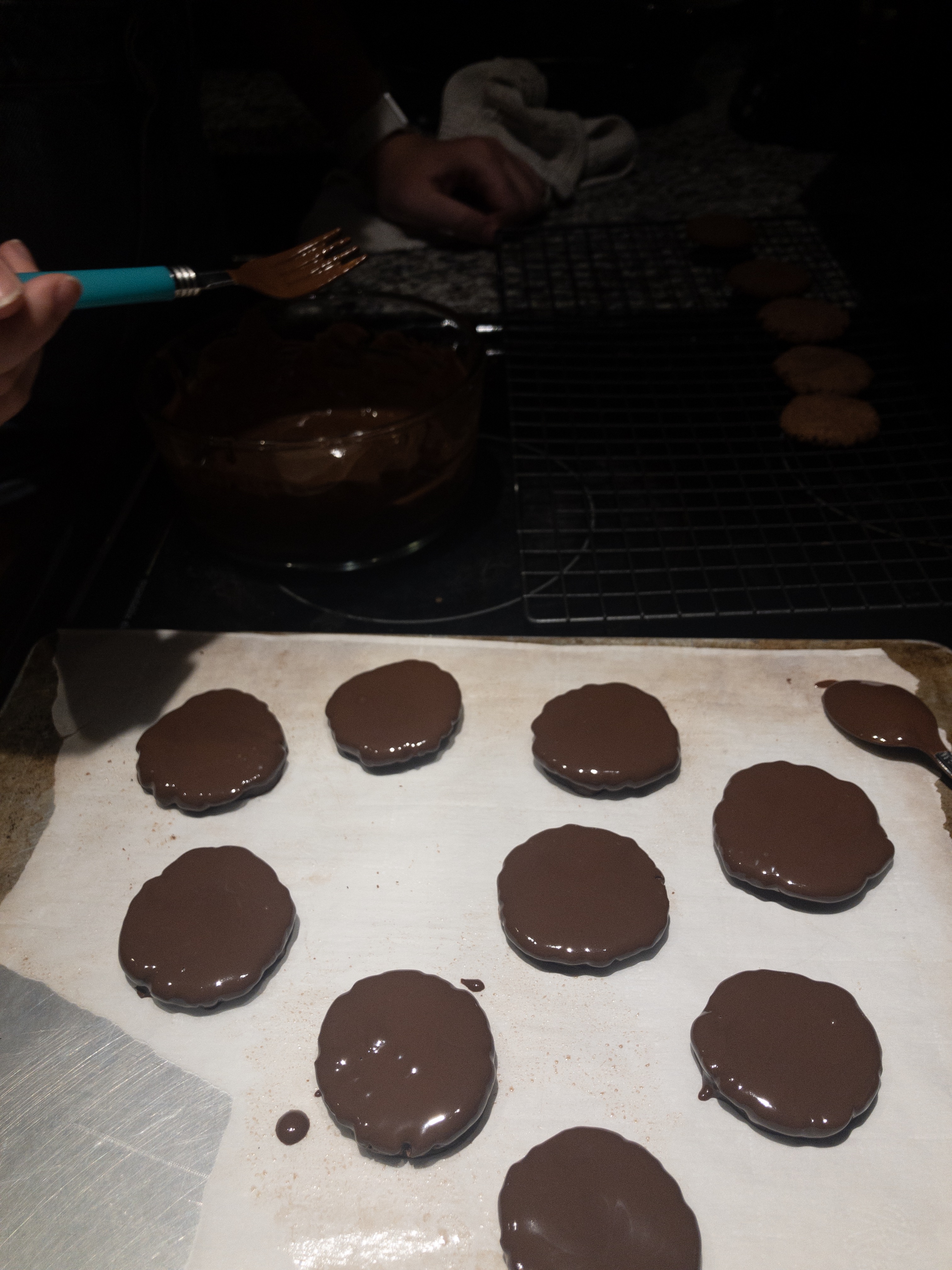 - Using a fork, dip the cookies into the chocolate coating mixture and place back onto the parchment paper.