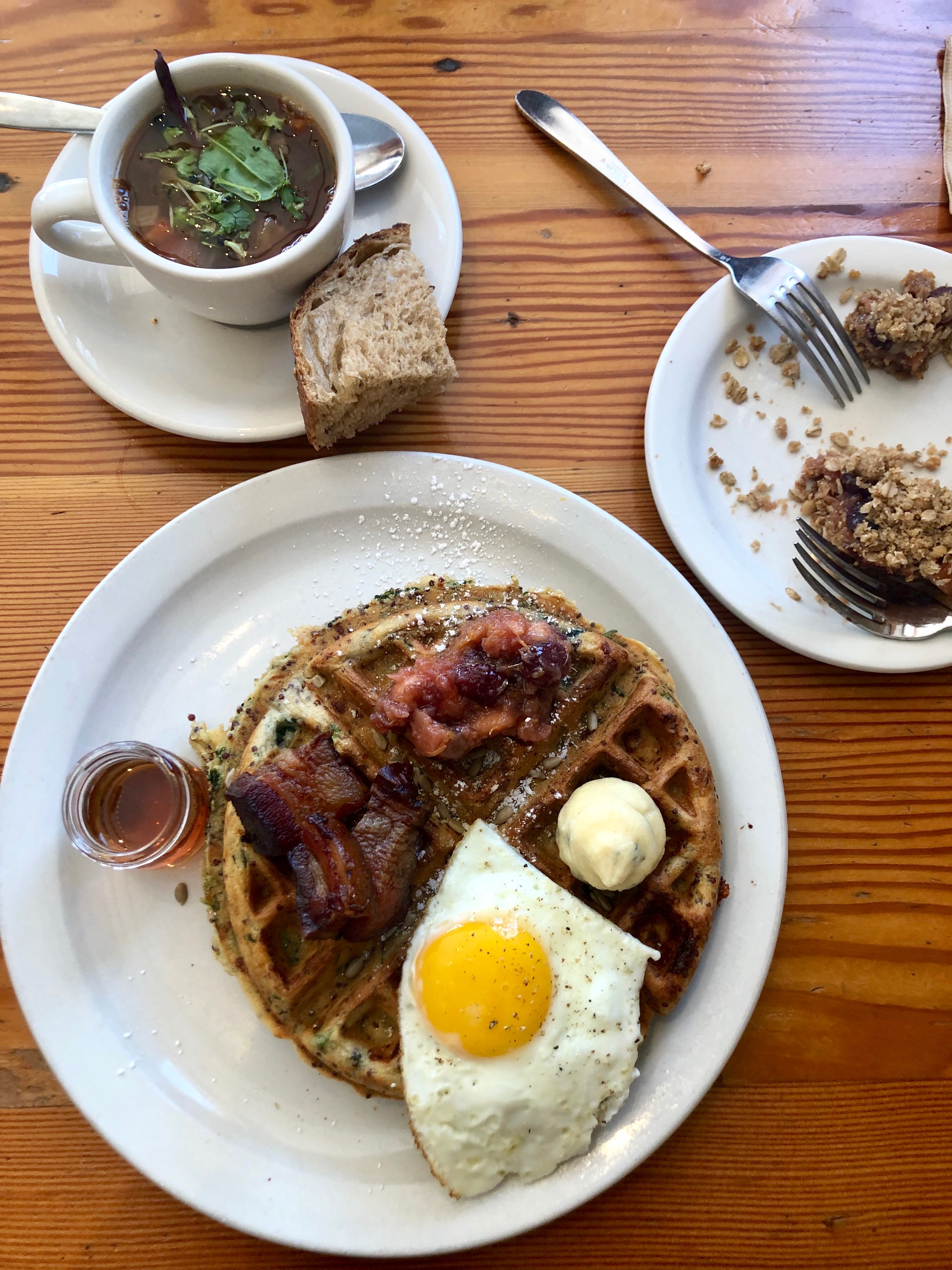 What you see on the waffle: a sunny-side up egg, super thick cut bacon, tomato jam, and spicy honey butter. All on a sweet corn, cornmeal and cheddar waffle.