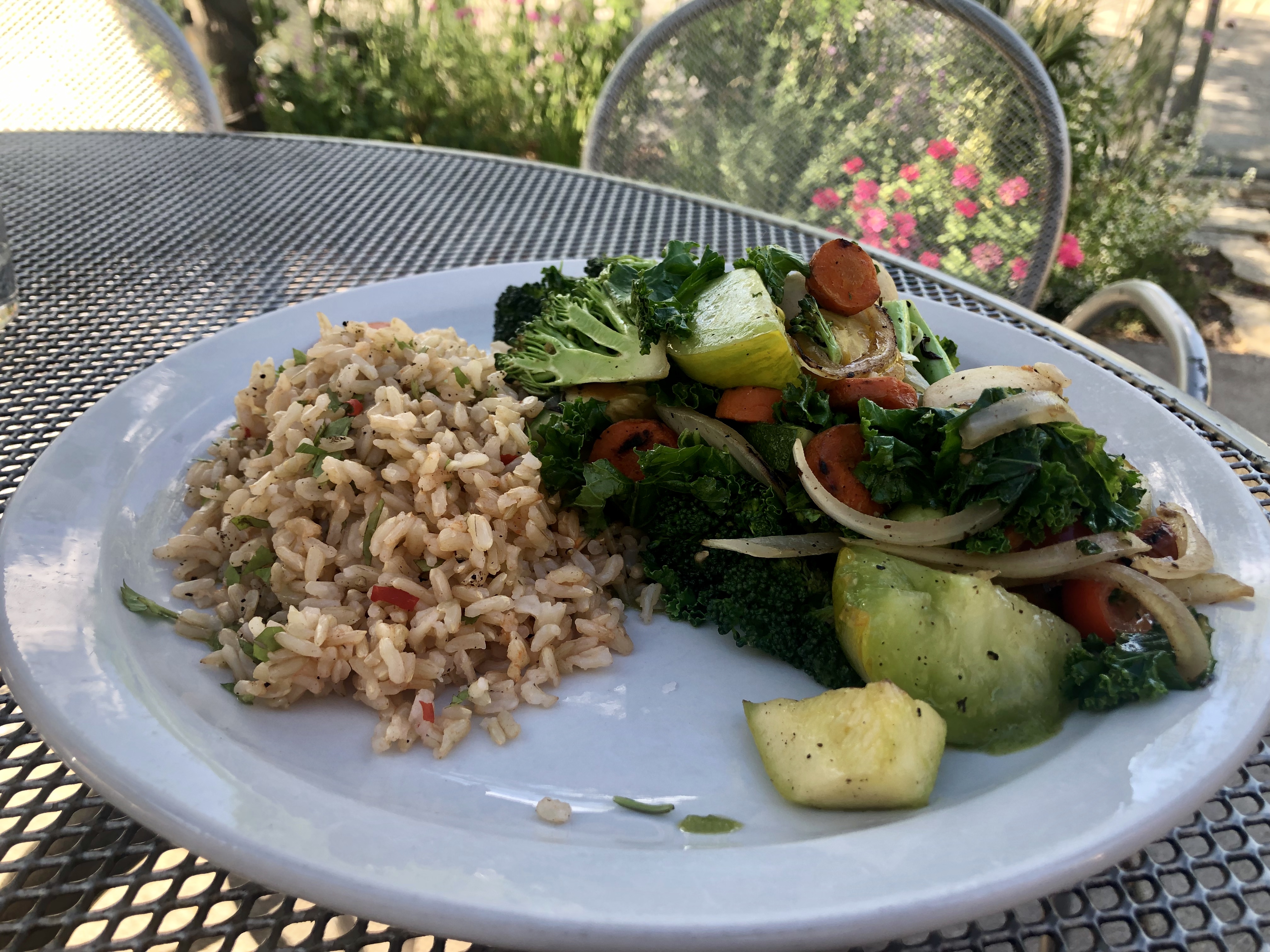 After taking a few bites of our dessert, our main meals came. I ordered the Veggies + Rice. The rice was spiced up with sambal and cilantro. It definitely had a kick to it. But, for someone who can’t tolerate much spiciness it was actually enjoyable. The rice was served with sautéed broccoli, kale, onions, tomatoes and carrots in a cucumber mint vinaigrette. It was delish!