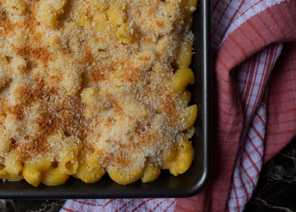 - Transfer the mac & cheese to a baking dish and top with panko breadcrumbs.