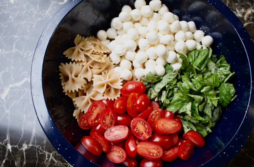 - Add the pasta, mozzarella, tomatoes, basil and dressing to a bowl and enjoy! 🙂