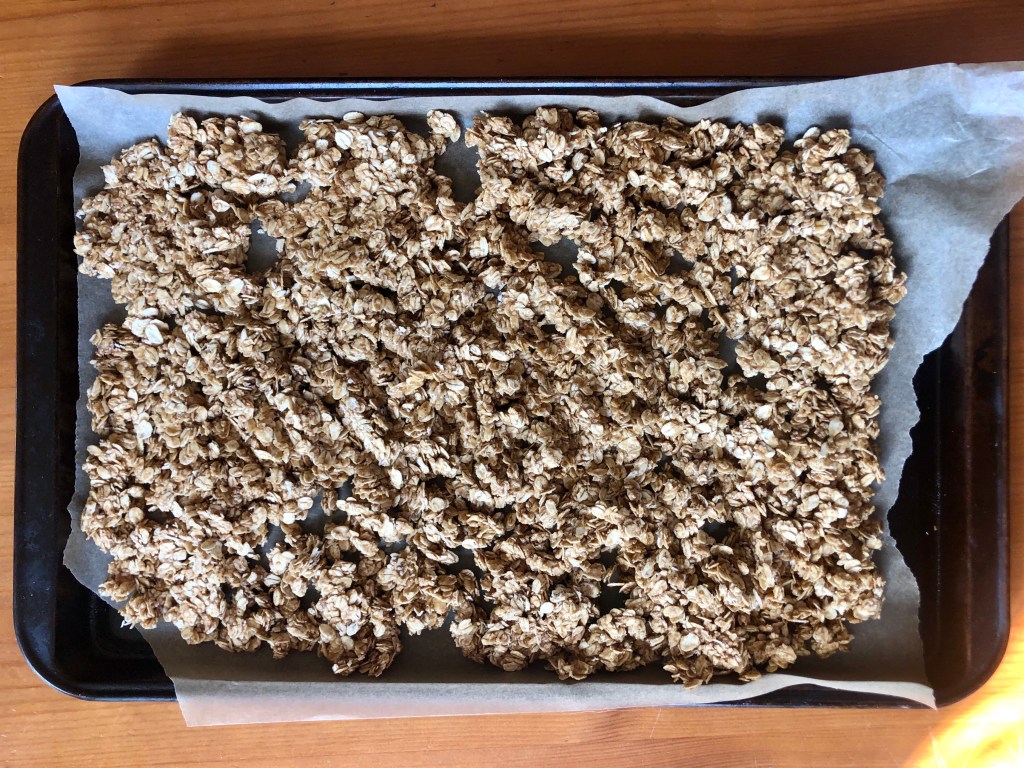 - Bake for 15-20 minutes, or until granola is golden. Don’t forget to stir halfway. Let a piece of the *golden* granola cool for a couple of minutes. If it gets crispy then it’s done.