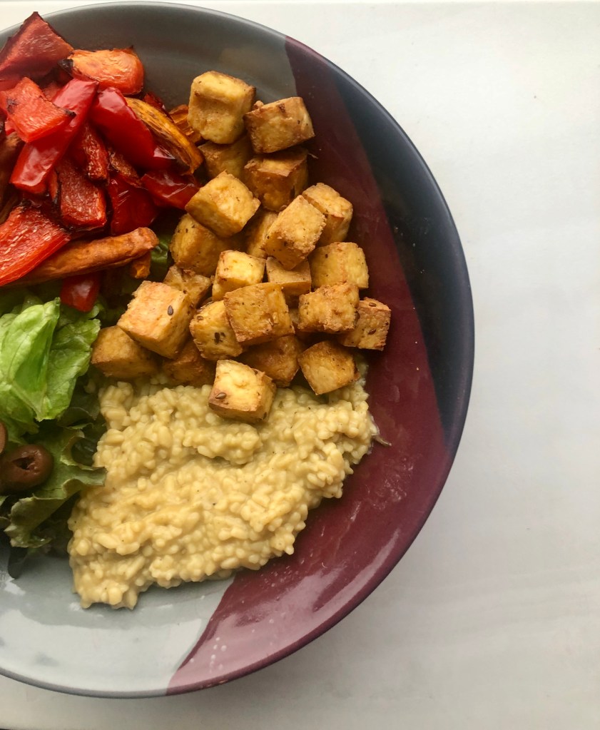 What’s my go-to meal? It’s a buddha bowl! I love buddha bowls because they’re nourishing, easy, and versatile. A buddha bowl requires minimal planning and I usually have all of the ingredients on hand to make it. You just need some veggies, a protein, and a grain. It’s as easy as that.